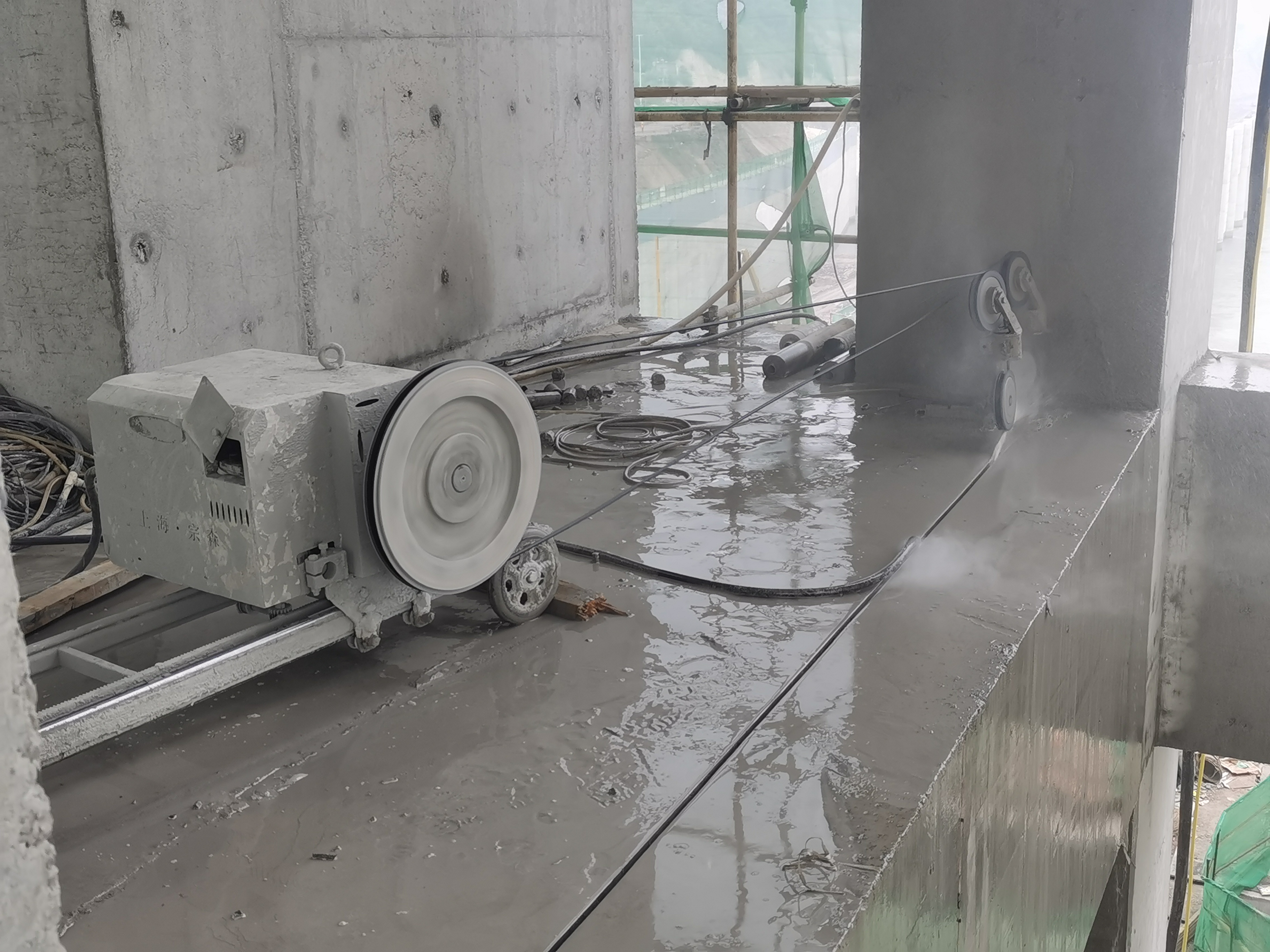 - 切割前,应检查绳锯切割机和金刚石绳锯的工作状态,确保其无损坏和故障,同时,应安装好绳锯切割机和导向轮,将金刚石绳锯缠绕在被切割的混凝土结构上,调整好绳锯的张力和位置,使其与被切割的混凝土结构贴合紧密,避免松动和滑动。